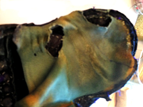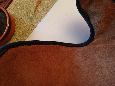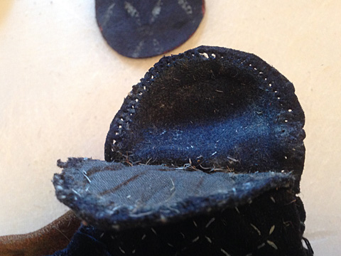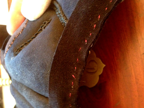 Pièce rajouté sur le dessus pour renforcer. cuir brut teint en indiguo ensuite.